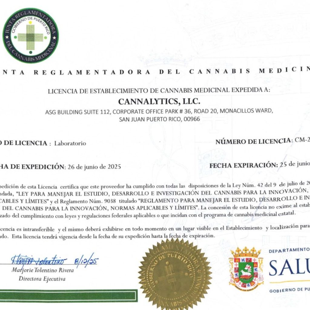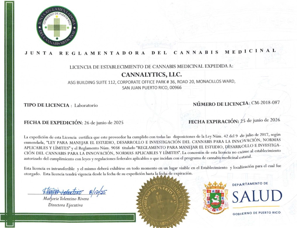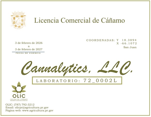 Our seal allows your clients to know that this product meets the strictest requirements of the Puerto Rico Health Department while complying with State Regulation. Ask for the Cannalytics Seal of Quality and let your clients know that their products are certified using best equipment and tests in the industry and with over 40 years of experience.